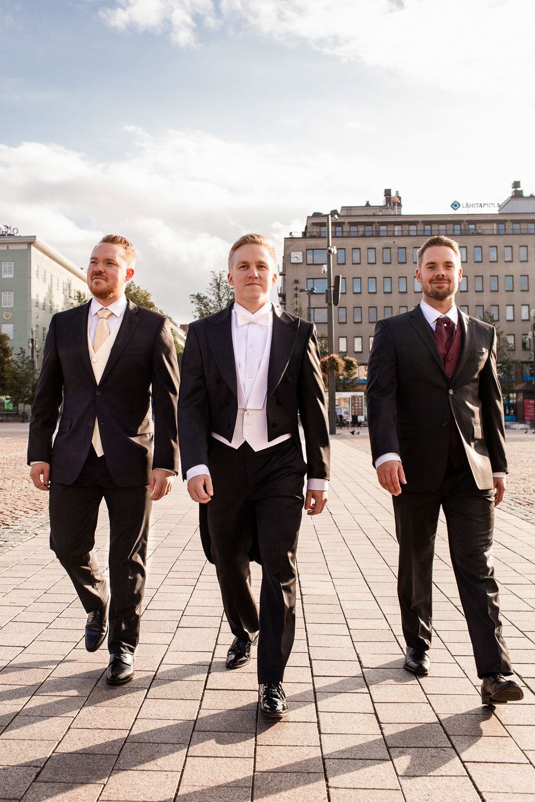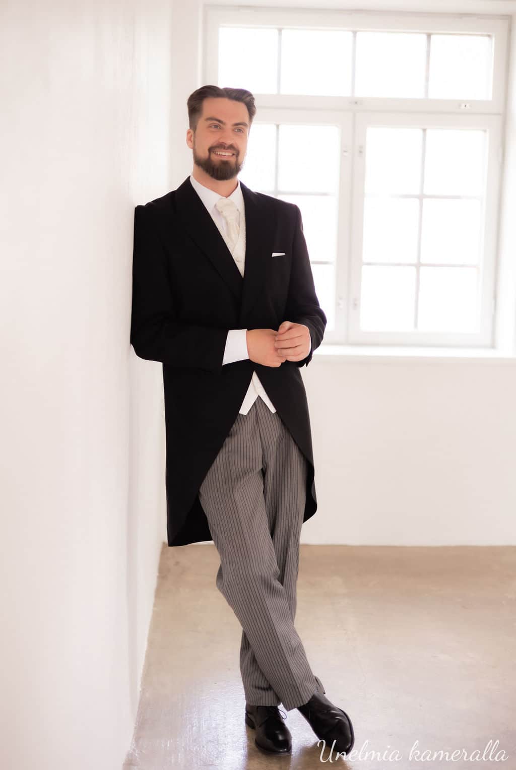 Valikoimastamme löydät frakit, saketit, smokit, sekä mustat ja värilliset puvut. Vuokraamme myös tyylikkäät pukuliivit, kravatit ja pukuun sopivat kengät.